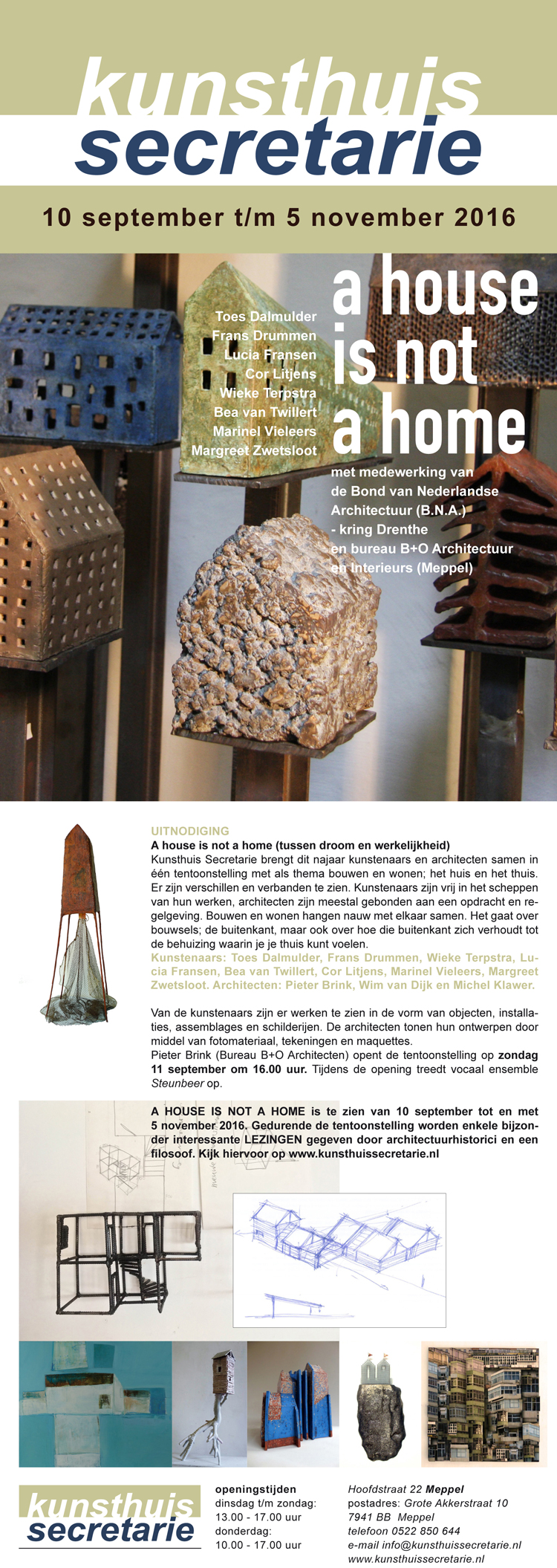 HOUSE IS NOT A HOME', met huizen waar ik woonde (klik hier voor de afbeeldingen) en de installatie 'A CHAIR IS NOT A HOME'. Opening op zondag 11 september om 16.00 uur door Pieter Brink (architect B+O Meppel). Kunsthuis Secretarie, Hoofdstraat 22, 7941AG Meppel Openingstijden: dinsdag tot en met zondag 13.00 - 17.00 uur (donderdag 10.00 tot 17.00 uur) Toegangsprijs € 2 (vrienden Secretarie gratis ) ![]() |