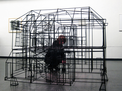 'Schoolgebouw / Stellatheater ' 8 mm.betonijzer, formaat:  ca.2.00x1.80x1.60 in de Haagse  Kunstkring sluit venster